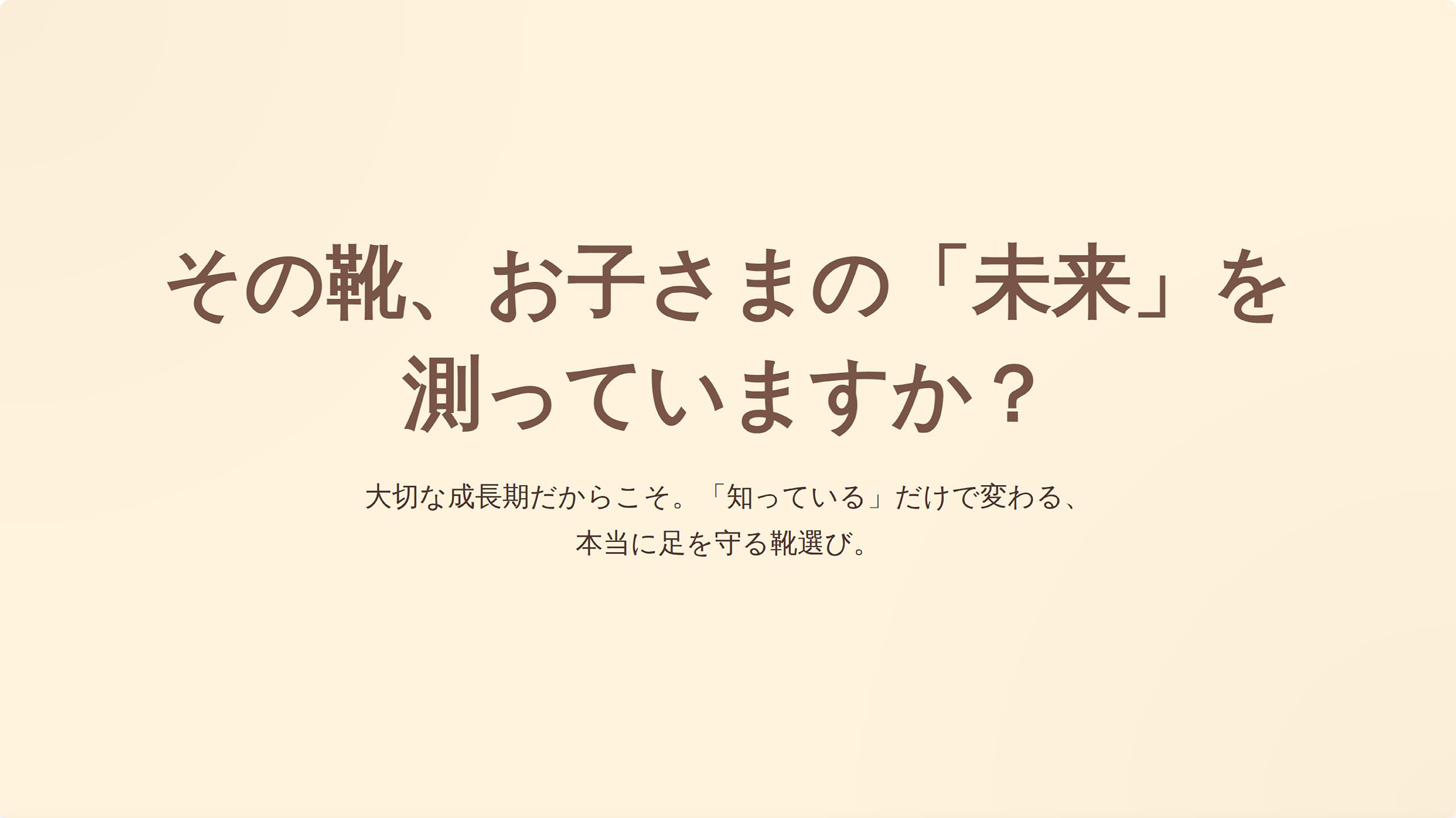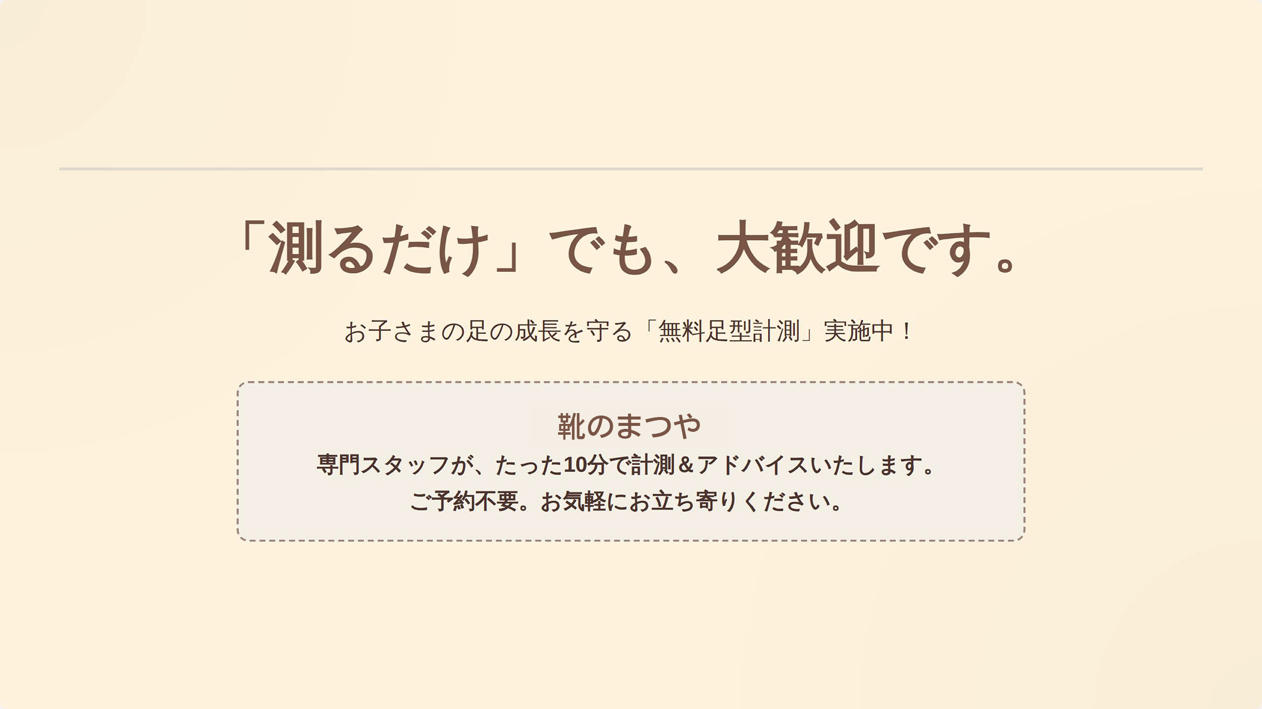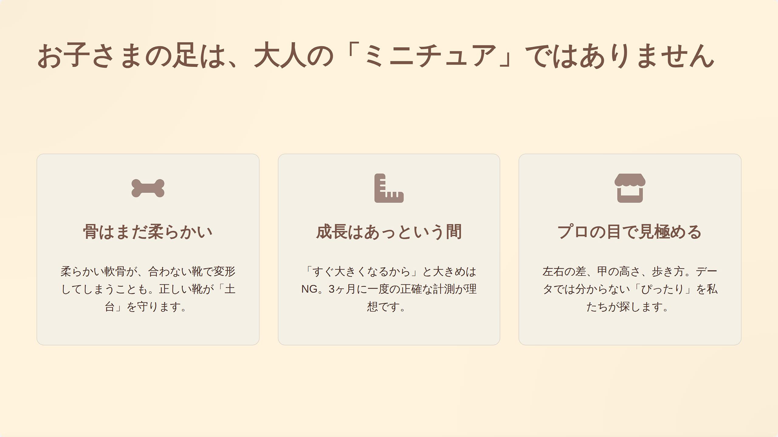 スタッフ:「ご来店ありがとうございます。そうだったんですね、それは心配ですよね。実は、お子様の足は骨もまだ柔らかく、とてもデリケートなんです。だからこそ、大人が『大丈夫だろう』と思って選んだ靴が、無意識に足の成長を邪魔してしまうこともあるんですよ。もしよろしければ、まず『今の足』を正しく測ってみませんか? 当店では、お子様の足の計測を無料で行っています。もちろん、計測だけでも大歓迎ですよ! 」