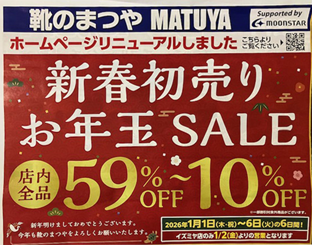 新春初売りお年玉SALE 2025.12.29 新春初売りお年玉SALE 店内全品59%OFF~10%OFF 2026年1月1日(木・祝)~6日(火)の6日間! ※イズミヤ店のみ1月2日(金)よりの営業となります。